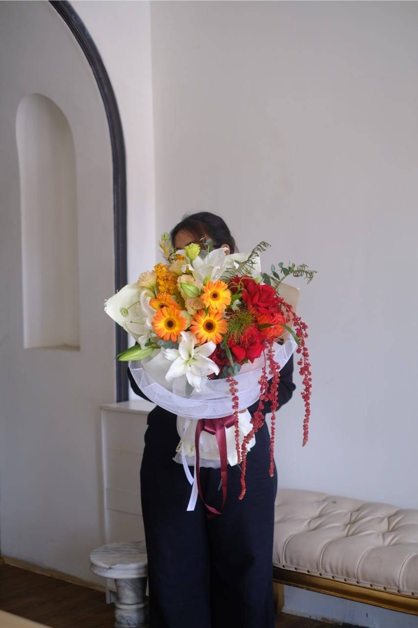Crimson Amber Bouquet brings together deep reds, glowing oranges, and soft golden tones in a composition that feels both powerful and refined. Inspired by the warmth of glowing embers at sunset, this bouquet carries a sense of passion, movement, and lasting warmth. Each bloom is carefully arranged to create a striking yet elegant silhouette, making it perfect for bold expressions of love, celebration, or admiration. This is not a quiet bouquet it’s a statement. Crimson Amber is made for moments that deserve to be felt, remembered, and truly seen.
