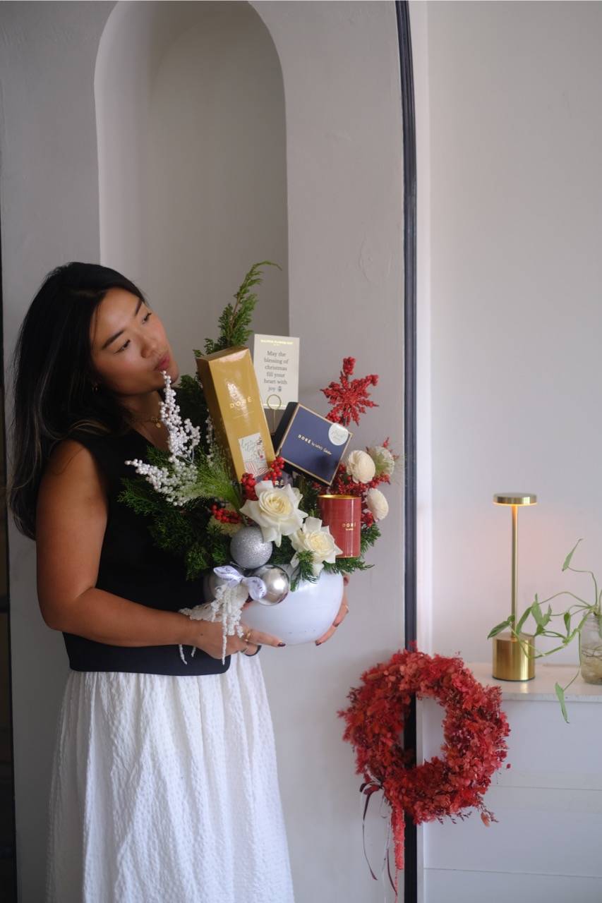 Vibrant flowers in a vase paired with delicate Christmas cookies create a luxurious festive gift set. Includes 2 boxes of cookies, 1 cookie can, and 1 Muscat White Tea, offering a complete indulgence of taste and beauty. An elegant gift that brings festive joy and sophistication to anyone this Christmas.