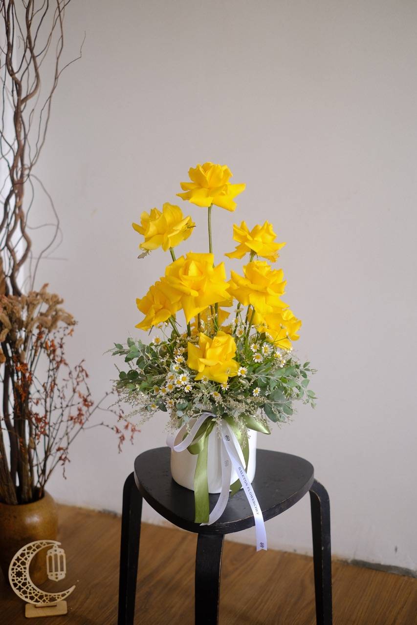 Bright yellow roses in a vase, symbolizing joy, warmth, and cherished moments this Ramadan