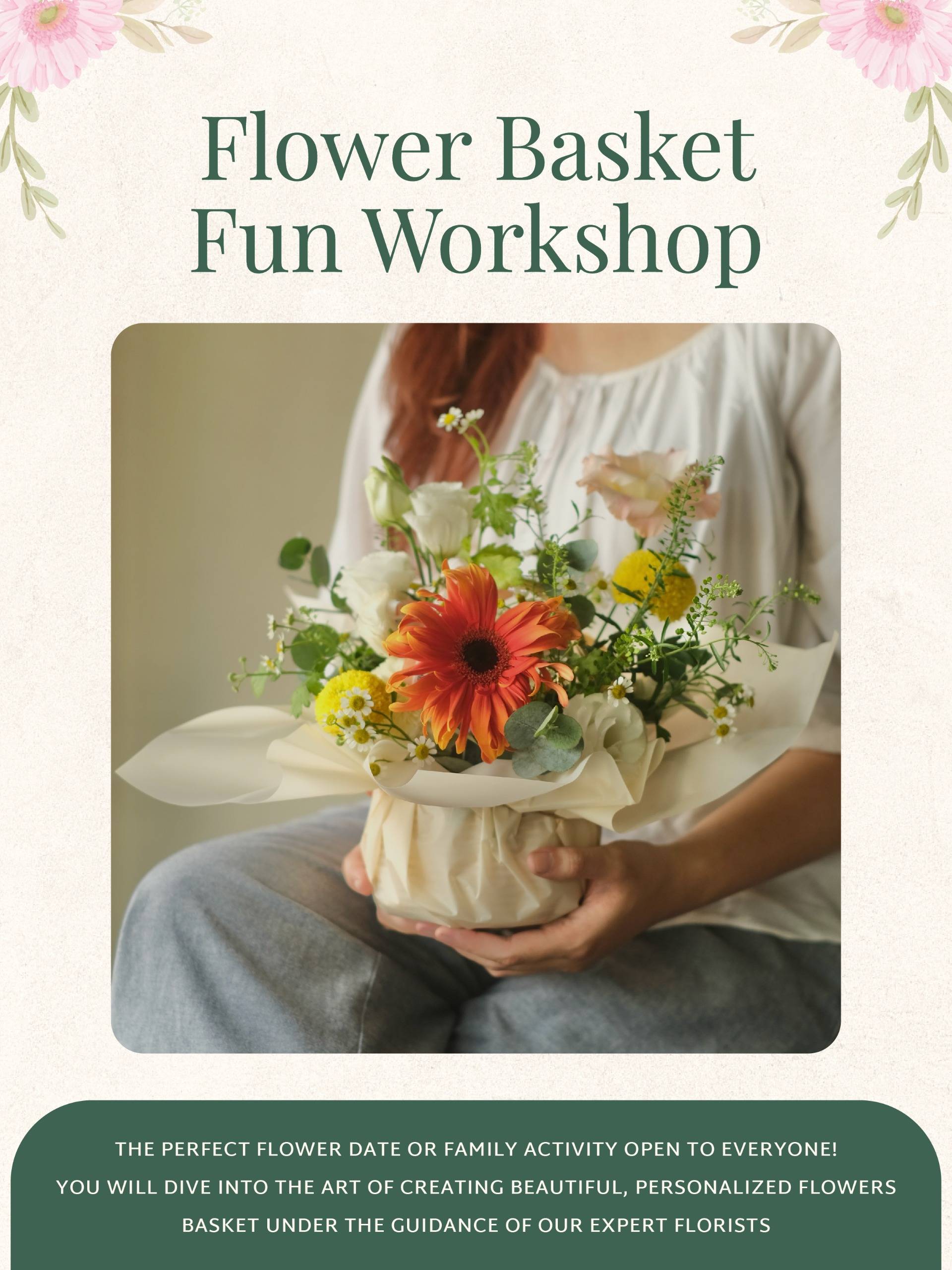 No experience? Don't worry! We'll guide you through it, easy-peasy. End up with your own floral creation to brag about. Join us—let's make some flower magic together! 🌼🧺✨