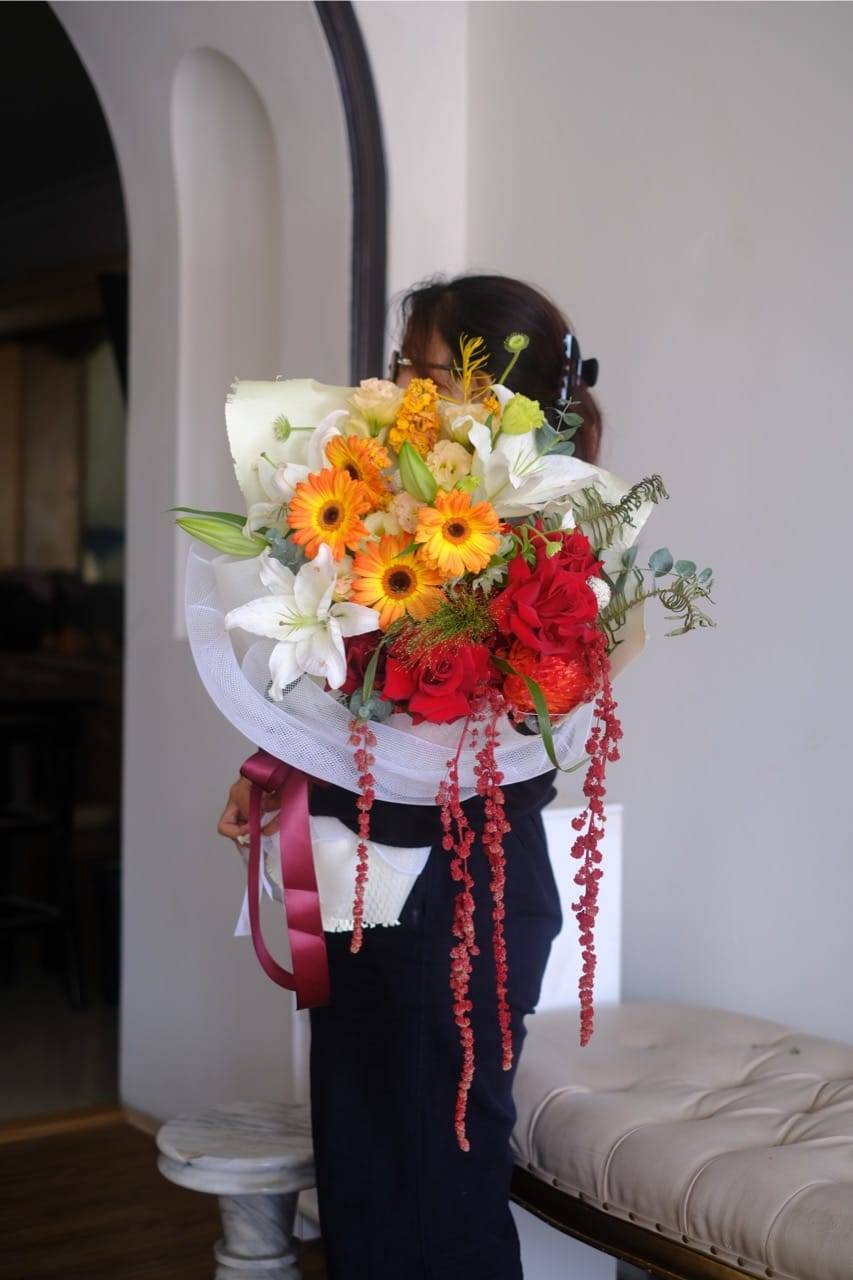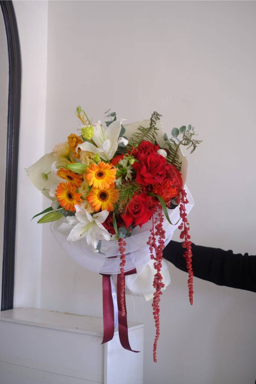 Crimson Amber Bouquet brings together deep reds, glowing oranges, and soft golden tones in a composition that feels both powerful and refined. Inspired by the warmth of glowing embers at sunset, this bouquet carries a sense of passion, movement, and lasting warmth. Each bloom is carefully arranged to create a striking yet elegant silhouette, making it perfect for bold expressions of love, celebration, or admiration. This is not a quiet bouquet it’s a statement. Crimson Amber is made for moments that deserve to be felt, remembered, and truly seen.