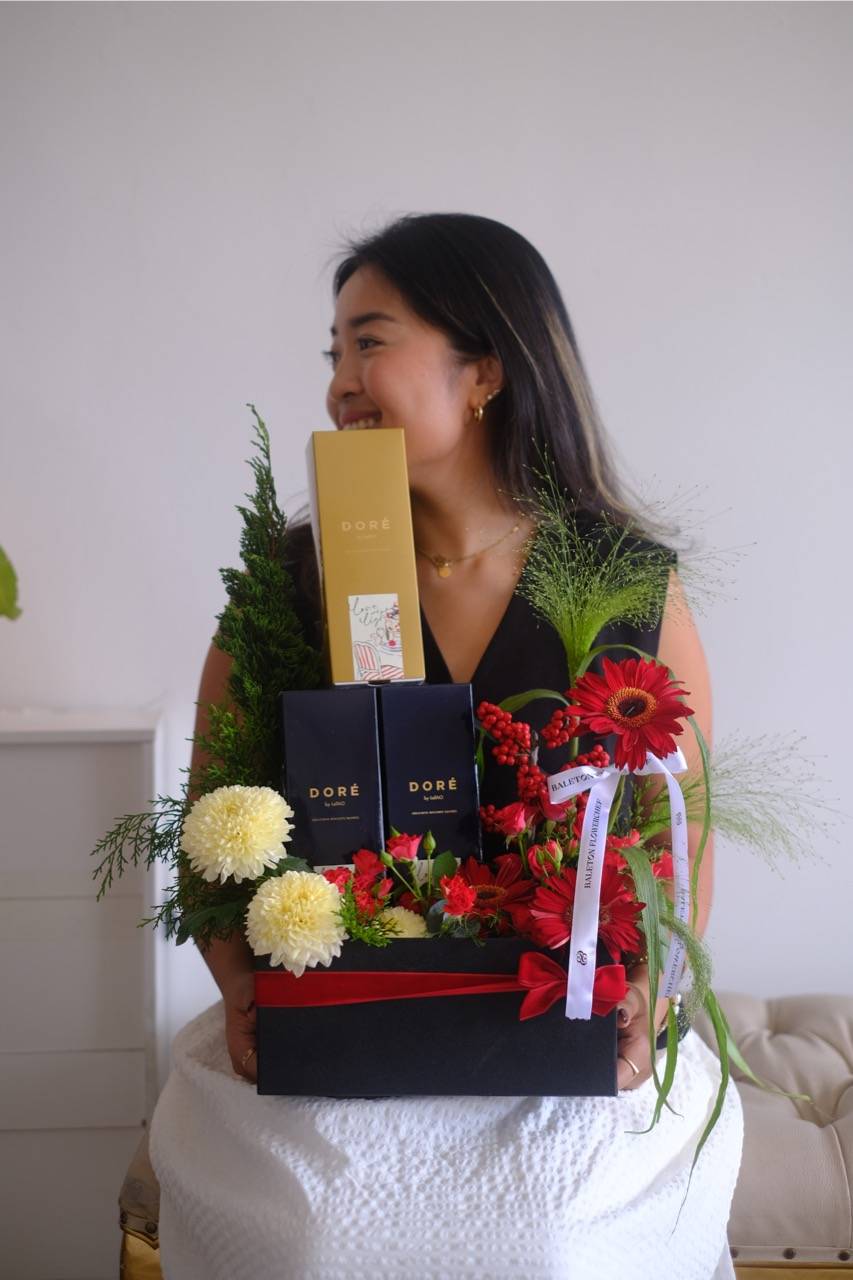 Fresh flowers meet artisanal Christmas cookies in a beautifully arranged box. Includes 3 boxes of handcrafted cookies, making it a delightful treat for both the eyes and the palate. A heartfelt gift that blends elegance with the warmth and cheer of Christmas. Perfect for gifting to friends, family, or colleagues this season.