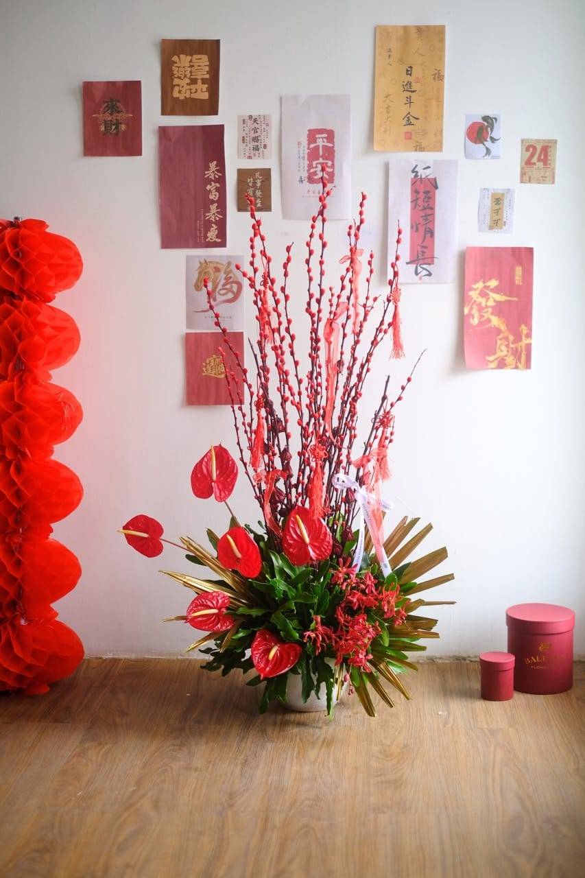 Red Willow Crest menggabungkan keindahan merah berani dengan pussy willow, Anthurium, dan Jimstory.