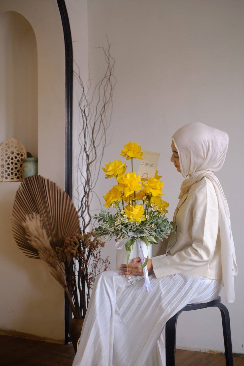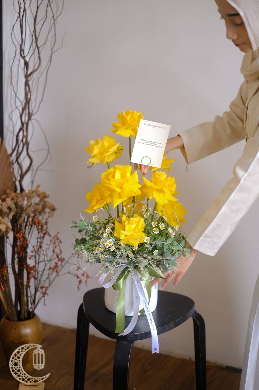 Bright yellow roses in a vase, symbolizing joy, warmth, and cherished moments this Ramadan