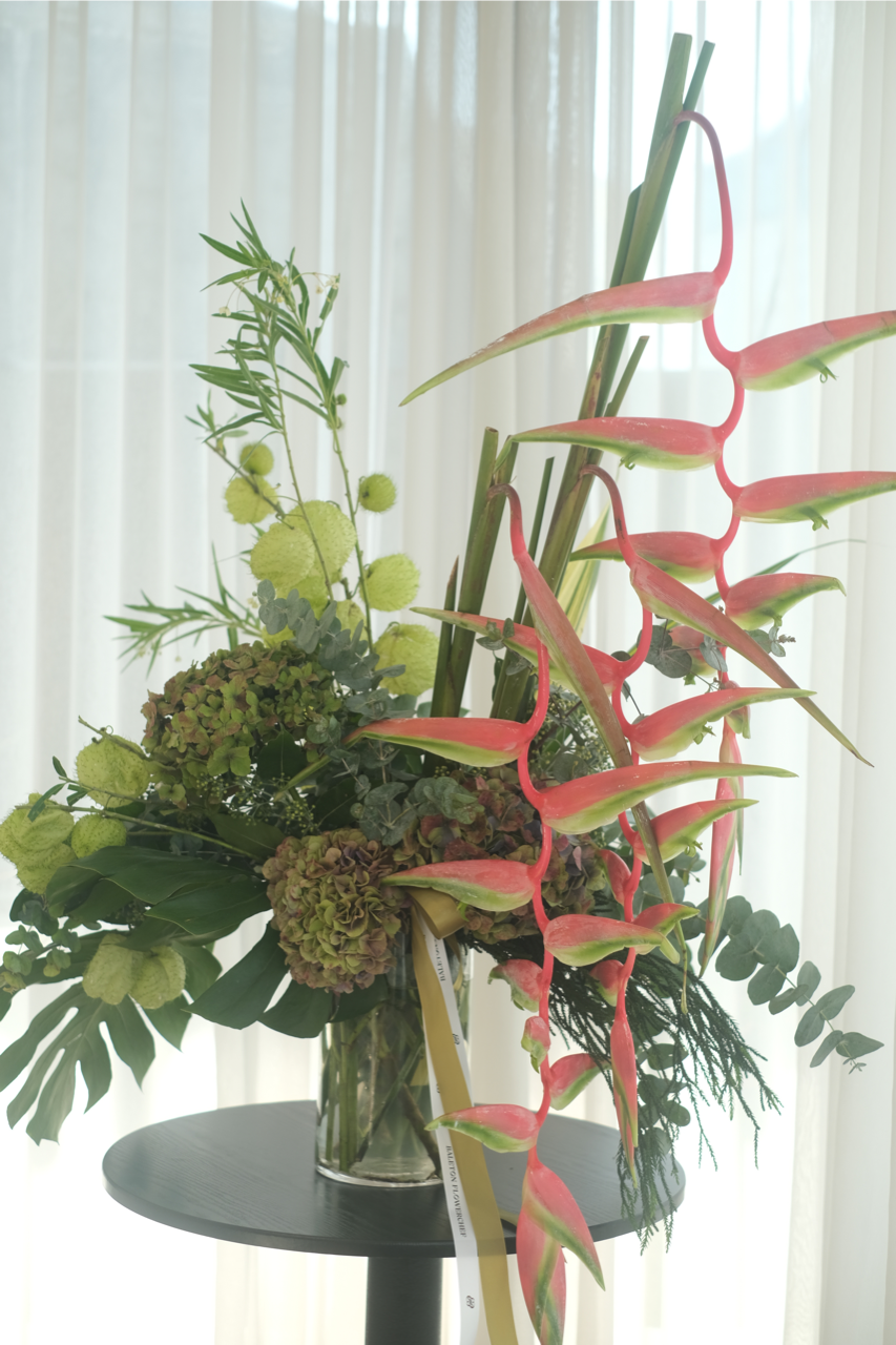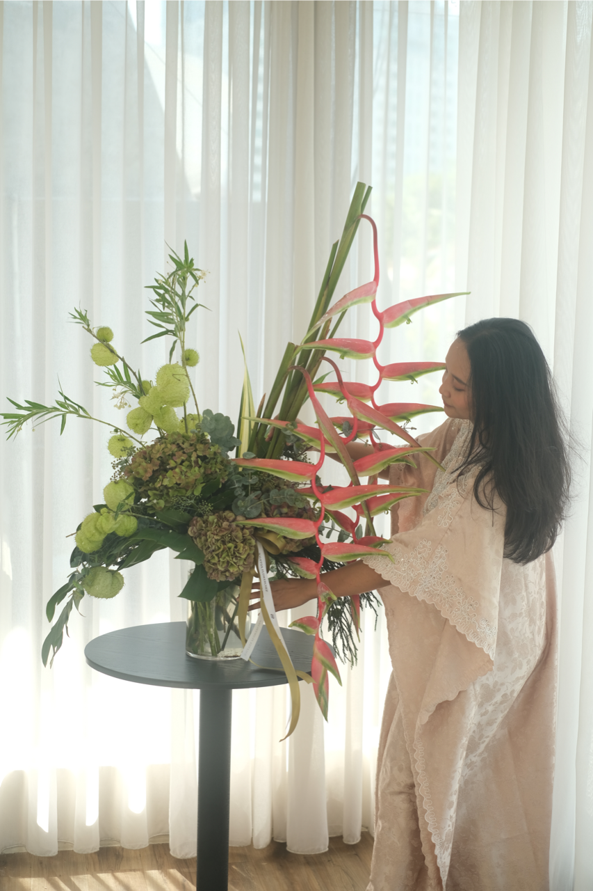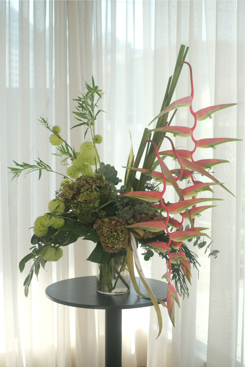 (Orders outside the pre-order schedule will be accepted as long as flowers are available) - Gorgeous heliconias, lush hydrangeas, and cool, green foliage almost whisper your apologies to your loved ones in the month of Ramadhan. Send this arrangement and spread smiles and greetings.
